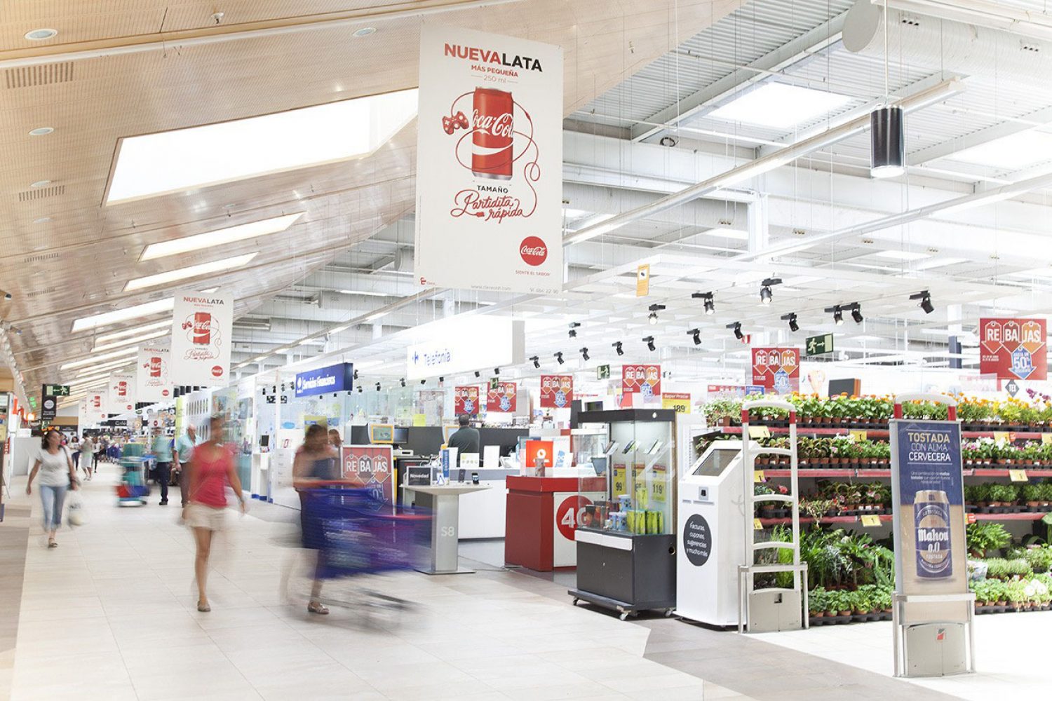 Espectacular campaña para promocionar su nueva lata de Coca Cola en los lineales de caja con 45m² de exhibición publicitaria en 40 centros comerciales Carrefour de España.