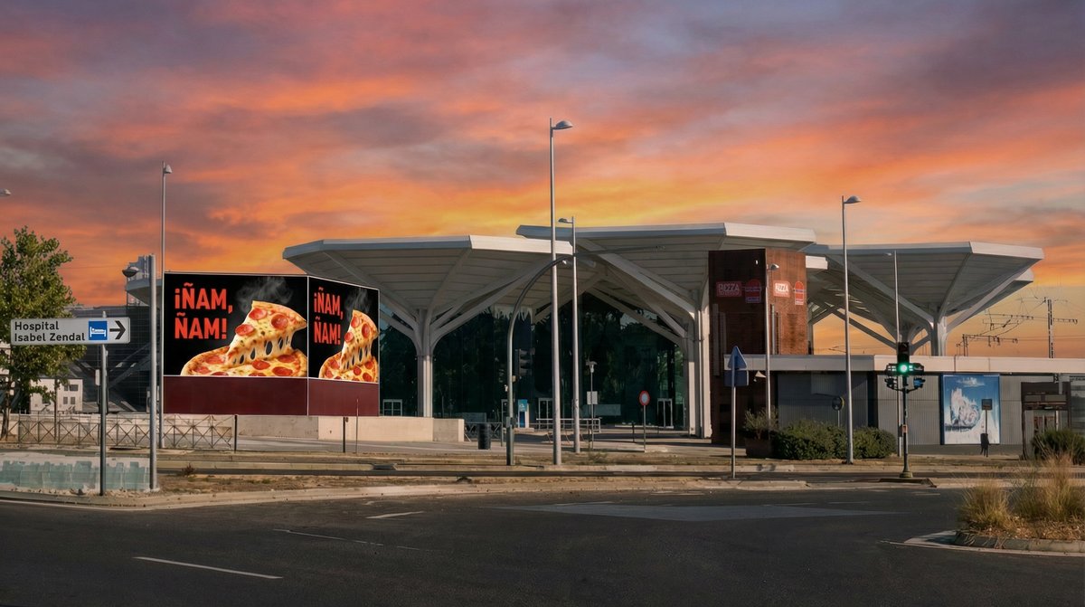 Conjunto de 4 pantallas digitales de exterior de 22,7 m2. Situadas dos de ellas en un cubo publicitario en el lateral del intercambiador de Valdebebas y otras dos en una columna digital en lateral opuesto. Junto al Hospital Isabel Zendal, Ciudad Deportiva del Real Madrid, Ciudad de la Justicia, nuevos pabellones de IFEMA y futuro circuito de Fórmula 1 «Madring».
